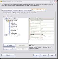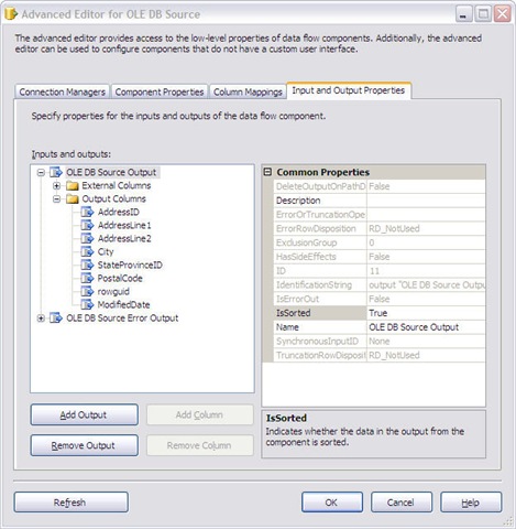 Now, when this package is executed, not only will the data be sorted (because we added an ORDER BY clause to our source query) but SSIS will know that the data is sorted as well, because we told it that it was. Now any downstream components (such as a Merge or Merge Join transformation) that require sorted inputs will be able to do what they need to do.