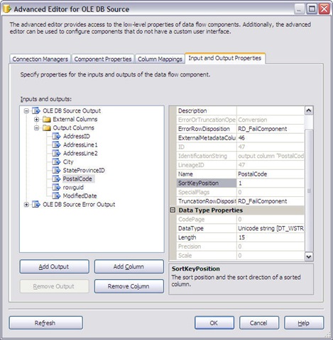 Next, set the SortKeyPosition property for the PostalCode and ModifiedDate columns in the Output Columns collection. Set SortKeyPosition to 1 for PostalCode because this is the first column in the ORDER BY clause. Set SortKeyPosition to -2 for ModifiedDate because this is the second column in the ORDER BY clause, and the column is marked as DESC - this is why it's -2 and not 2.